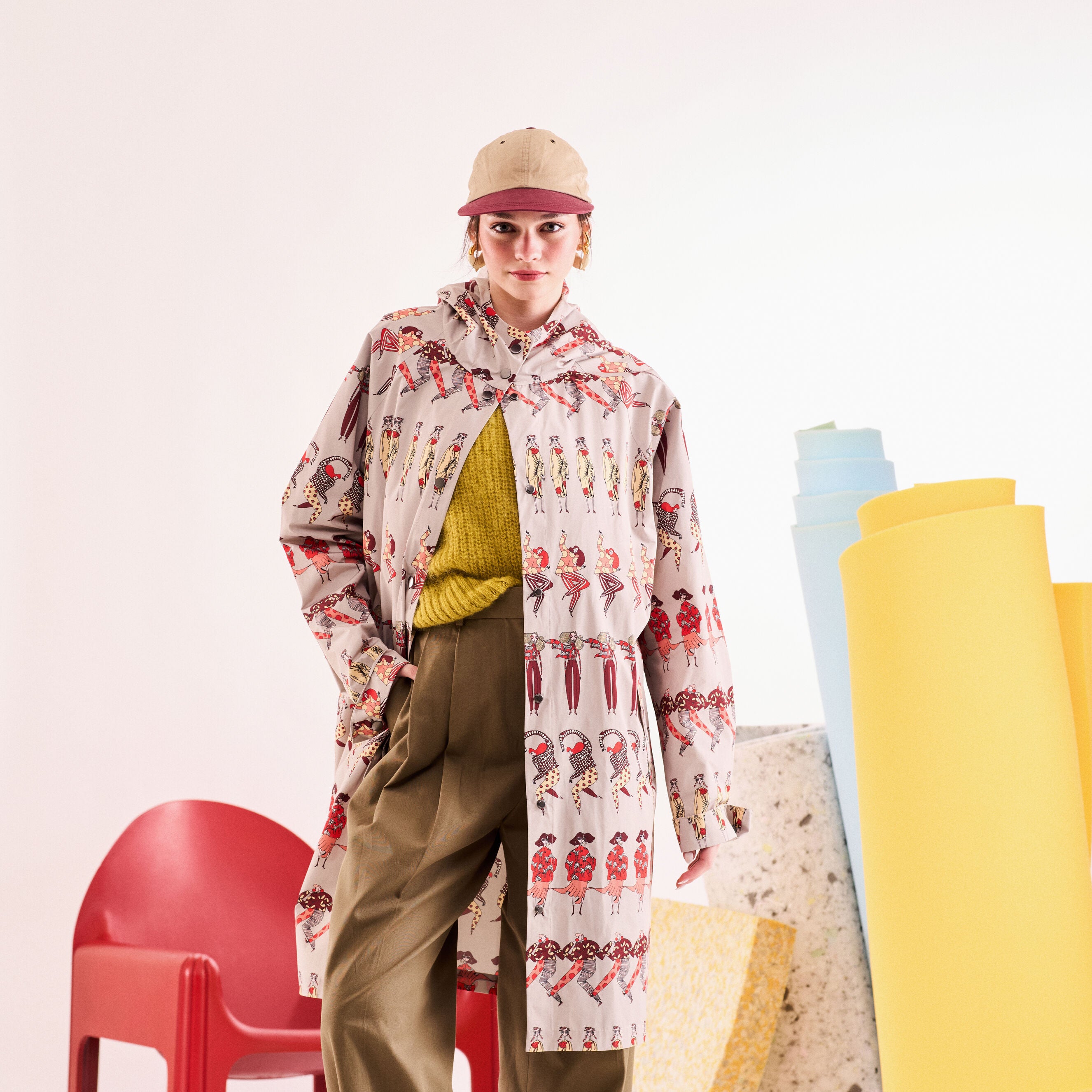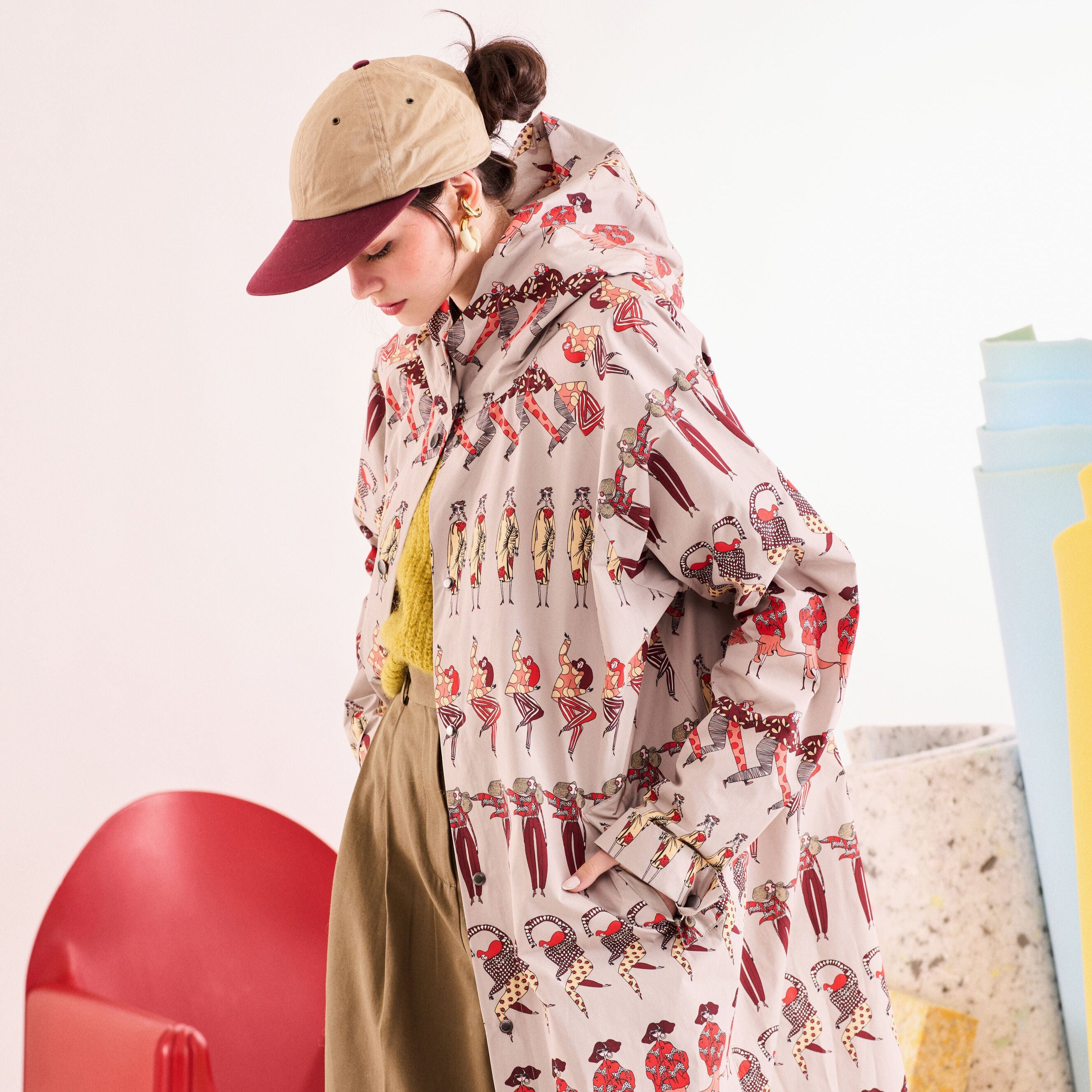 - %80 polyester, %20 pamuk kumaştan, unisex rahat kesimli, reglan kollu, mat metal çıt-çıt ile önden kapamalı, kapüşonu kendi deseninden astarlı, manşetleri çıt-çıt ile ayarlanabilir, 29 cm x 22,5 cm’lik kendi kumaş zarf çantası içinde taşınabilir yağmurluk.