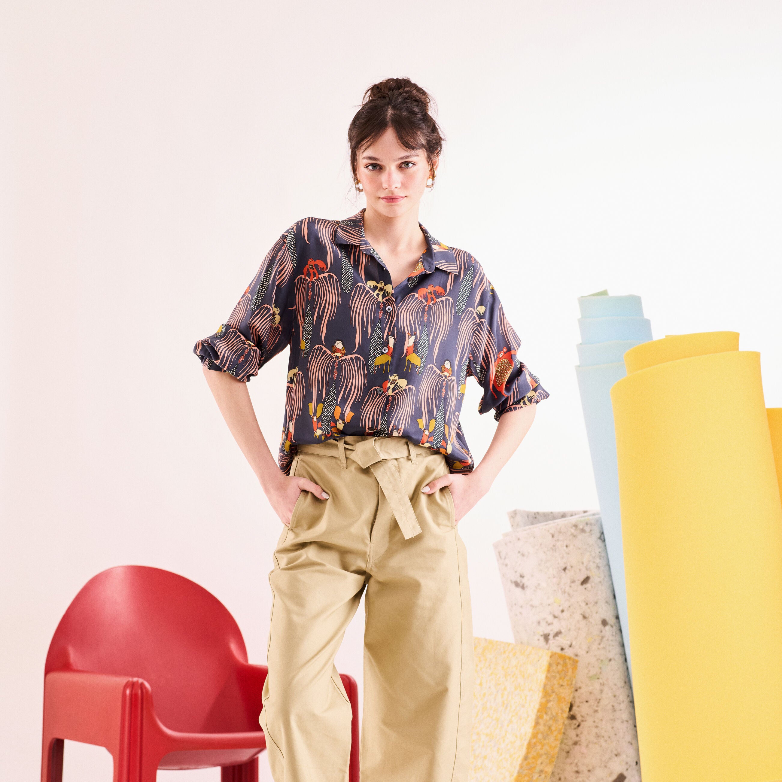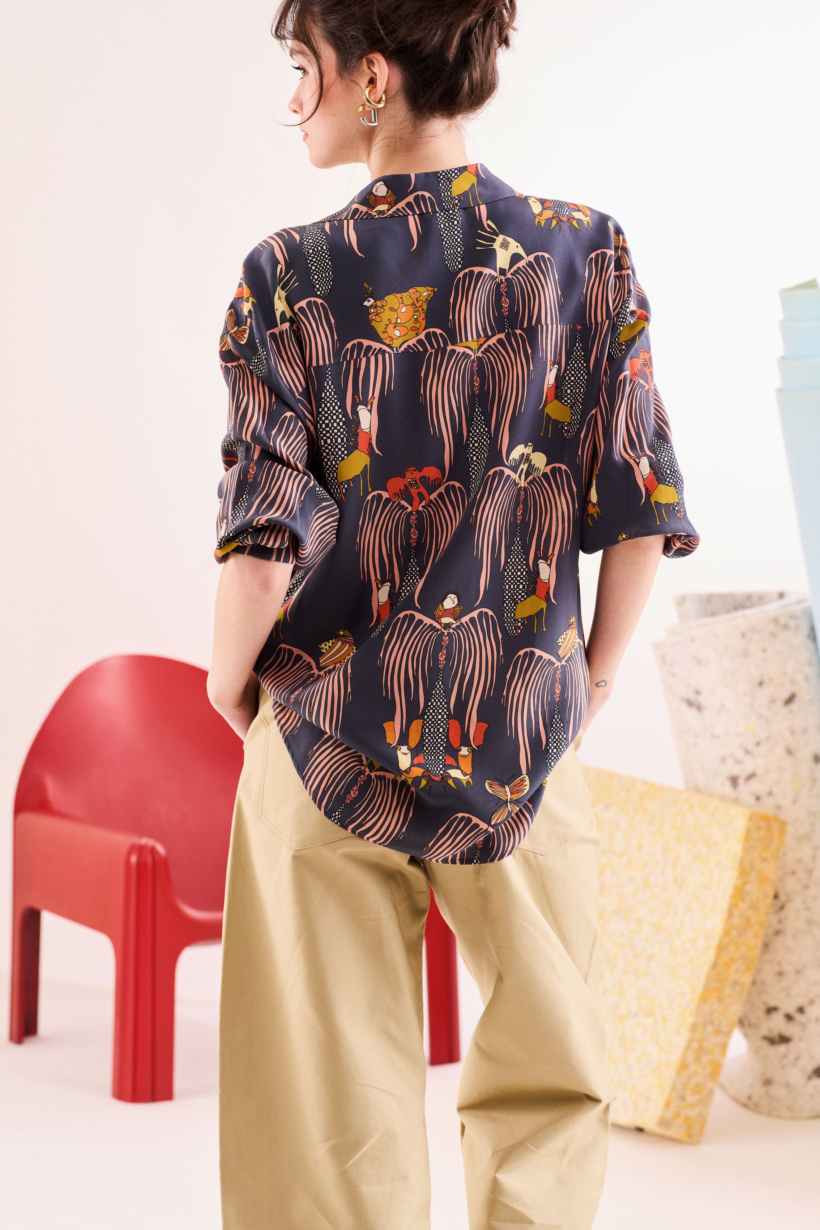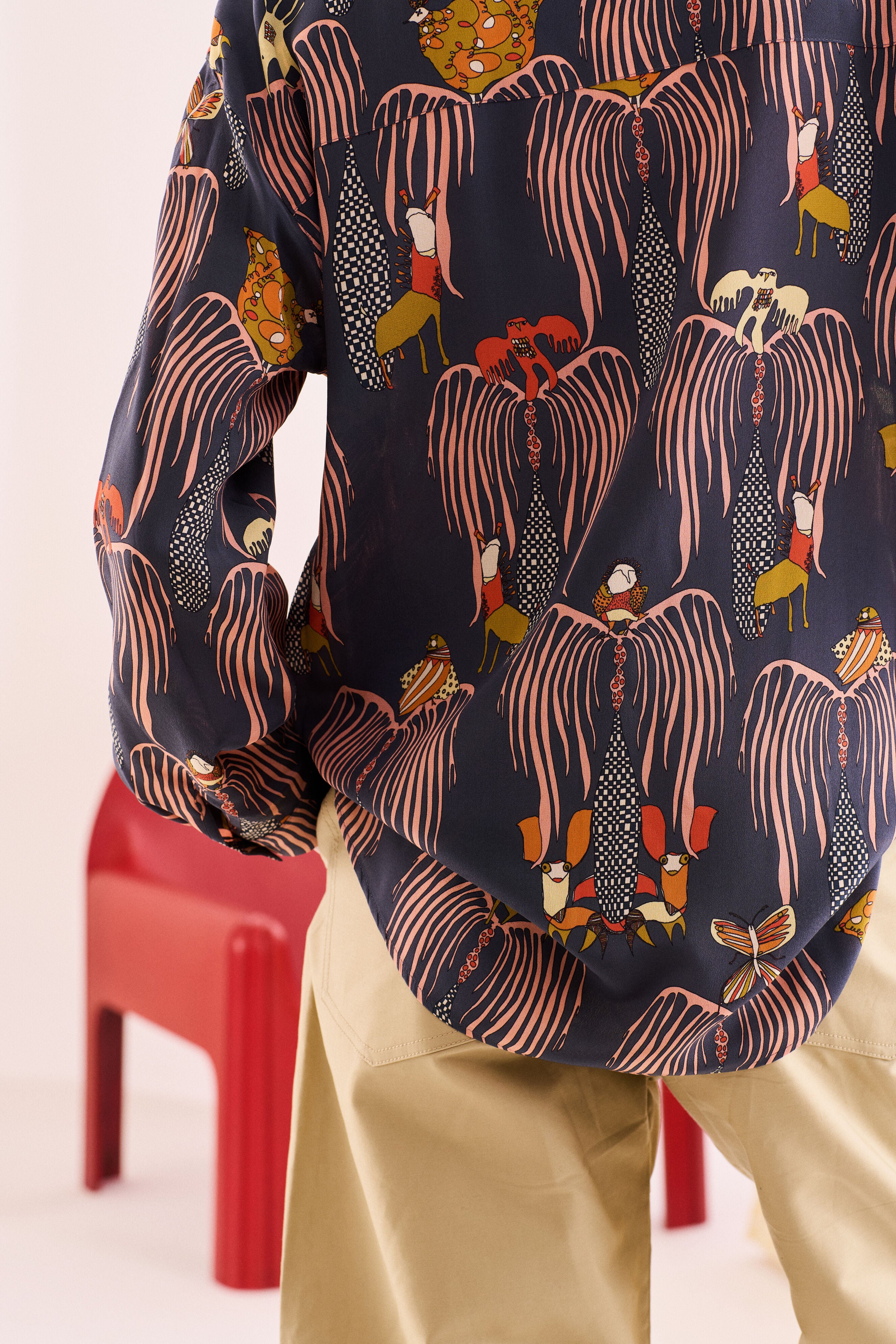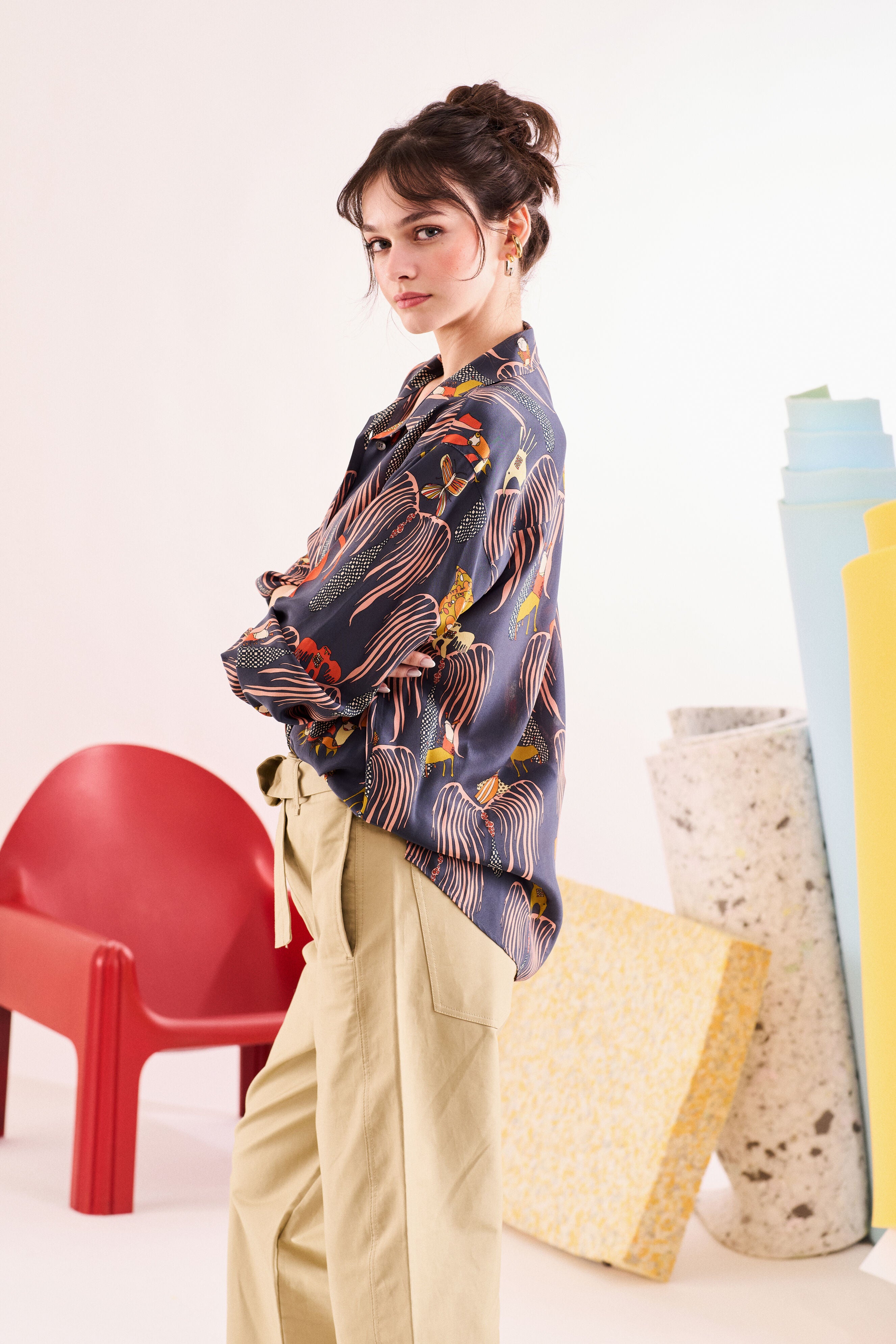 - %100 ipek crepe de chine kumaştan, klasik kesimli, önden düğmeli uzun kollu gömlek.