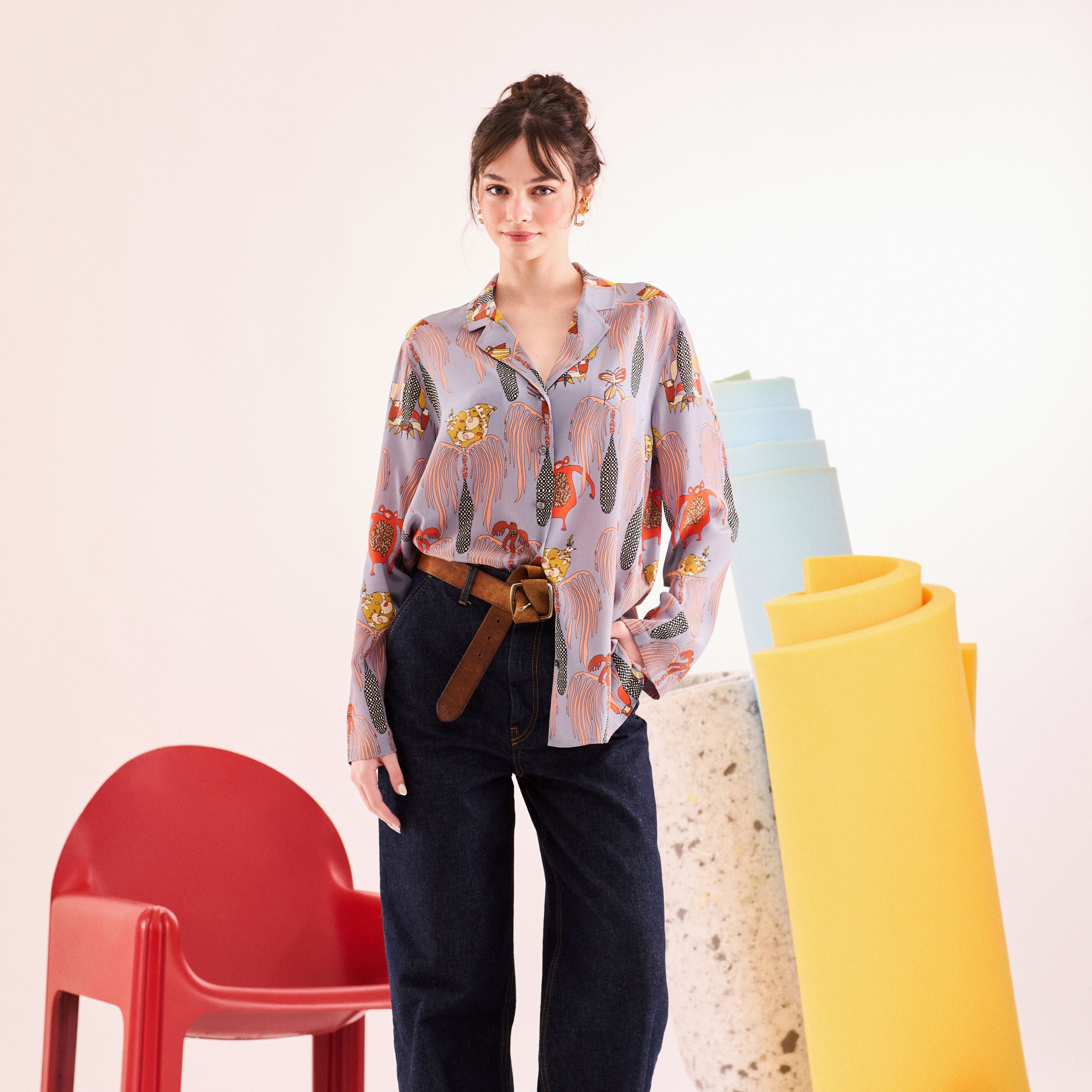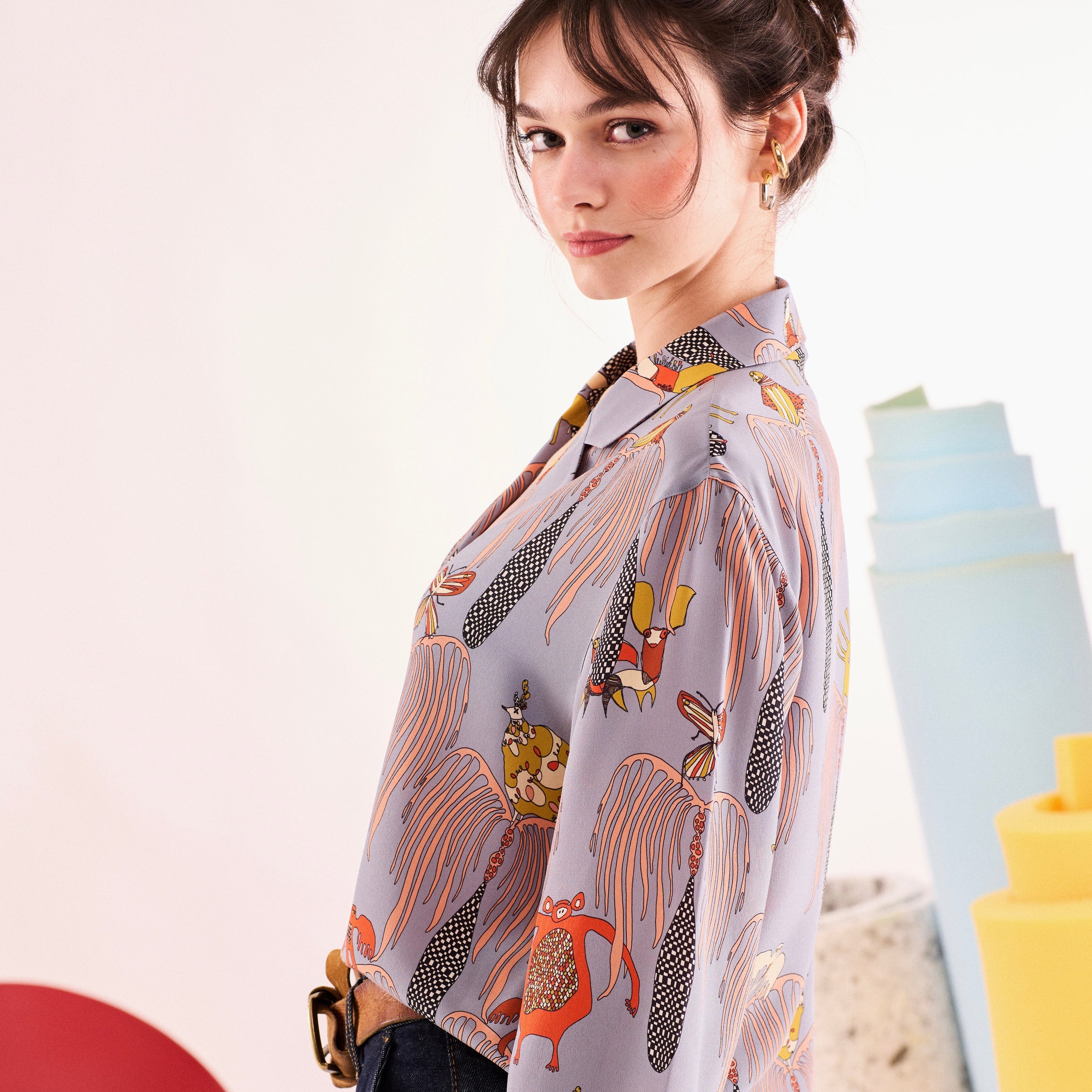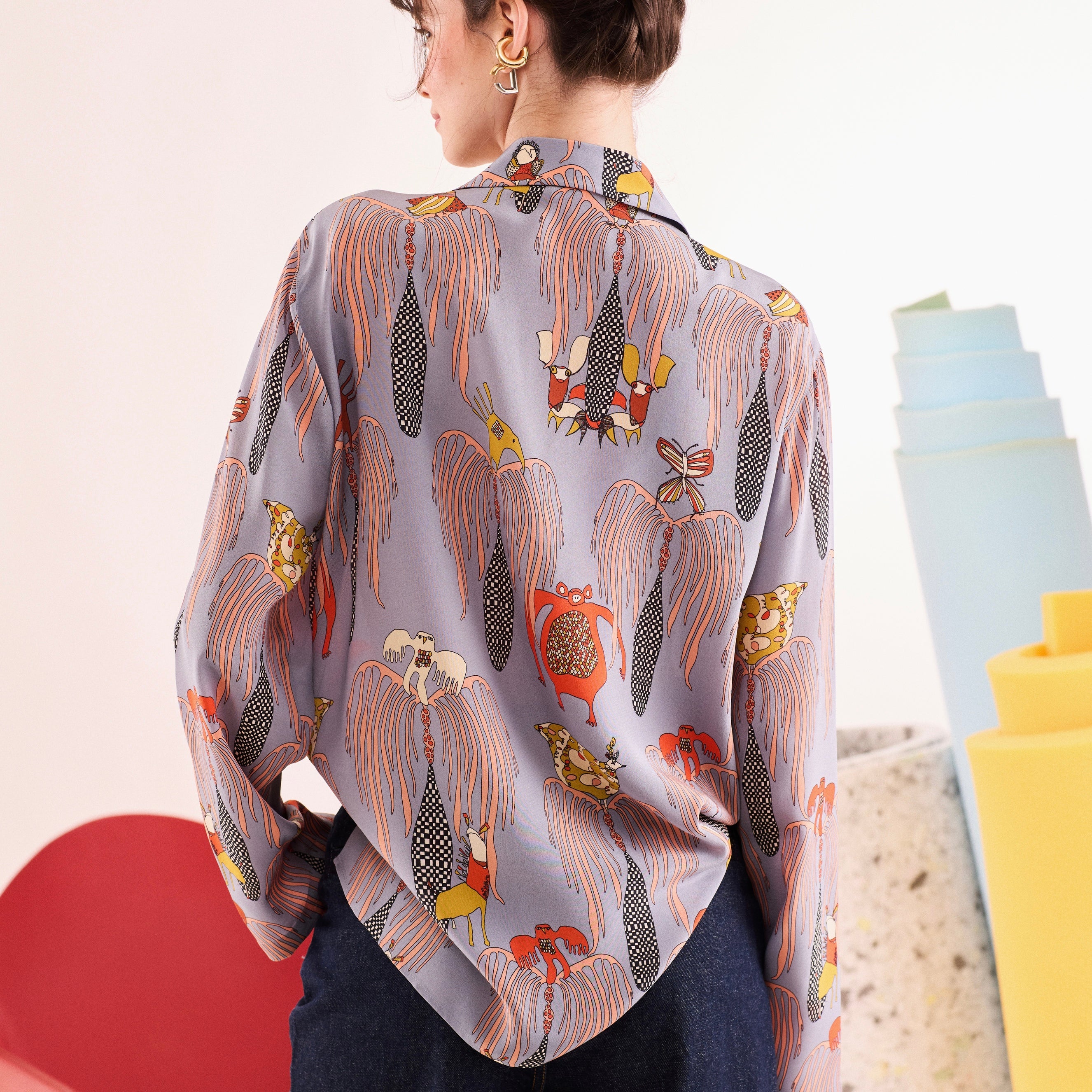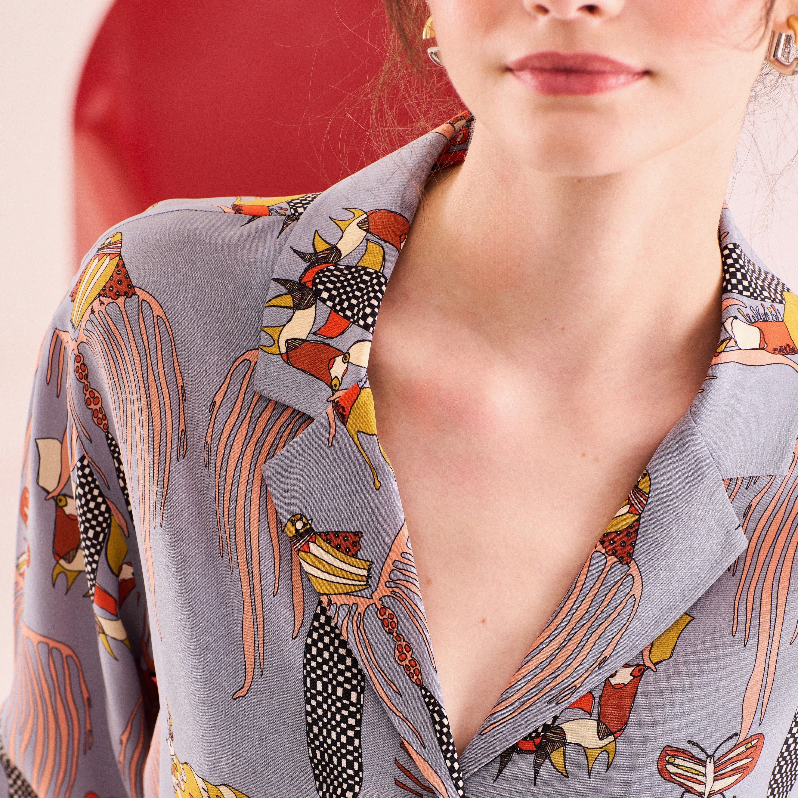 - %100 ipek crepe de chine kumaştan, bol kesimli, önden düğmeli, pijama tipi gömlek.