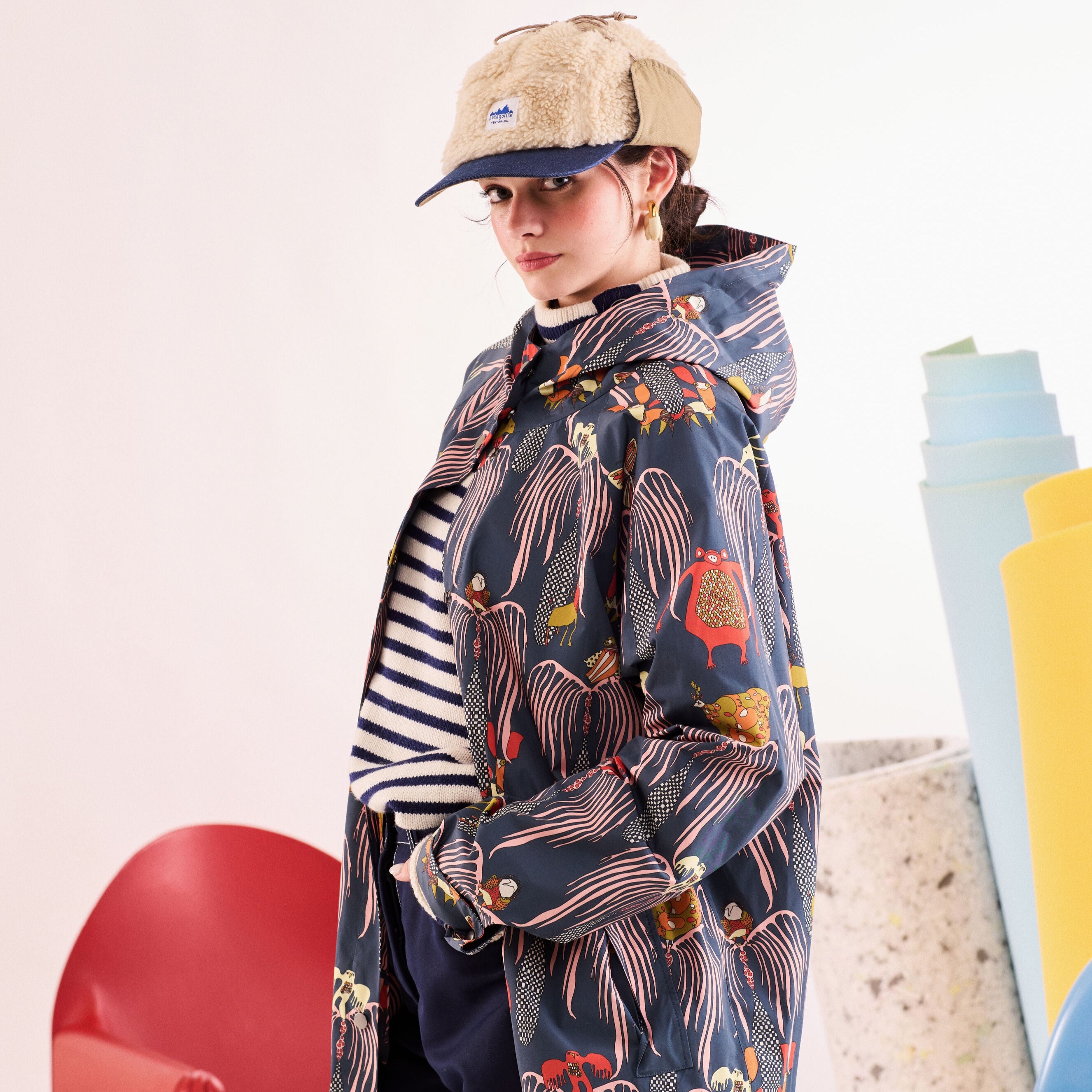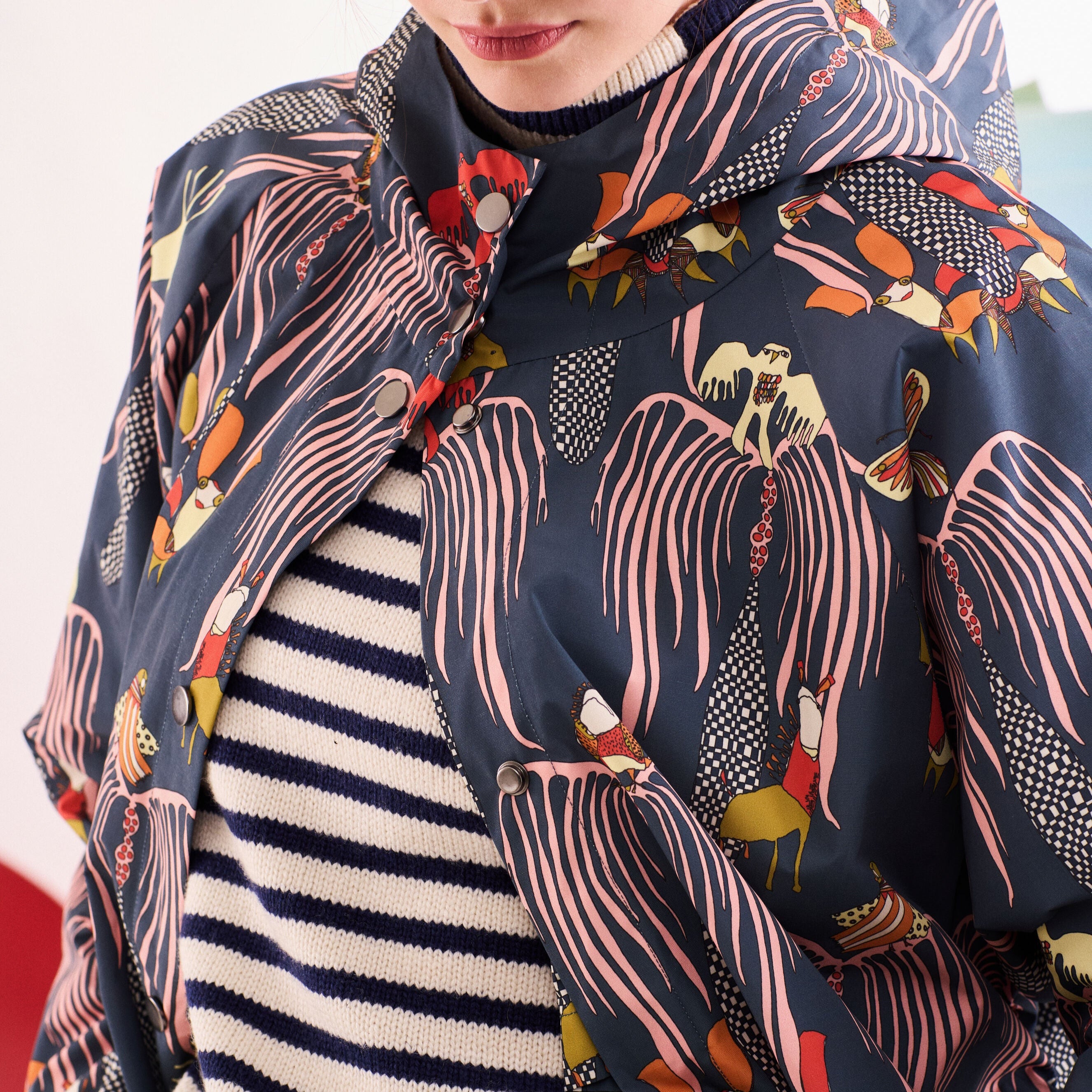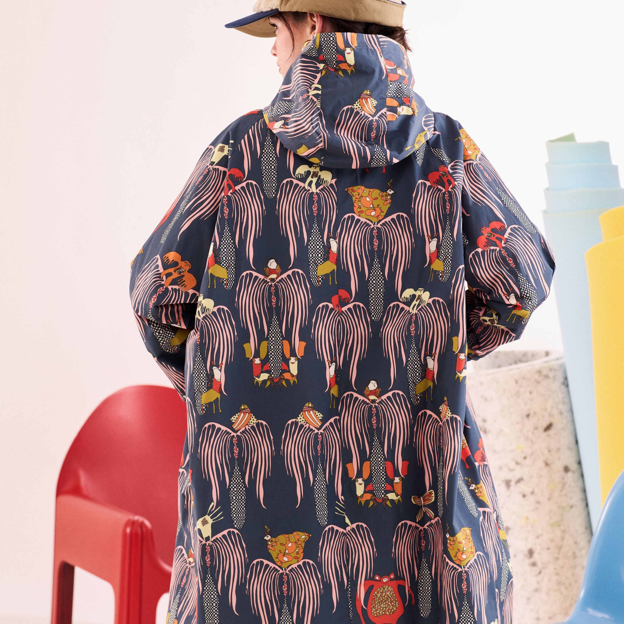 - %80 polyester, %20 pamuk kumaştan, unisex rahat kesimli, reglan kollu, mat metal çıt-çıt ile önden kapamalı, kapüşonu kendi deseninden astarlı, manşetleri çıt-çıt ile ayarlanabilir, 29 cm x 22,5 cm’lik kendi kumaş zarf çantası içinde taşınabilir yağmurluk.